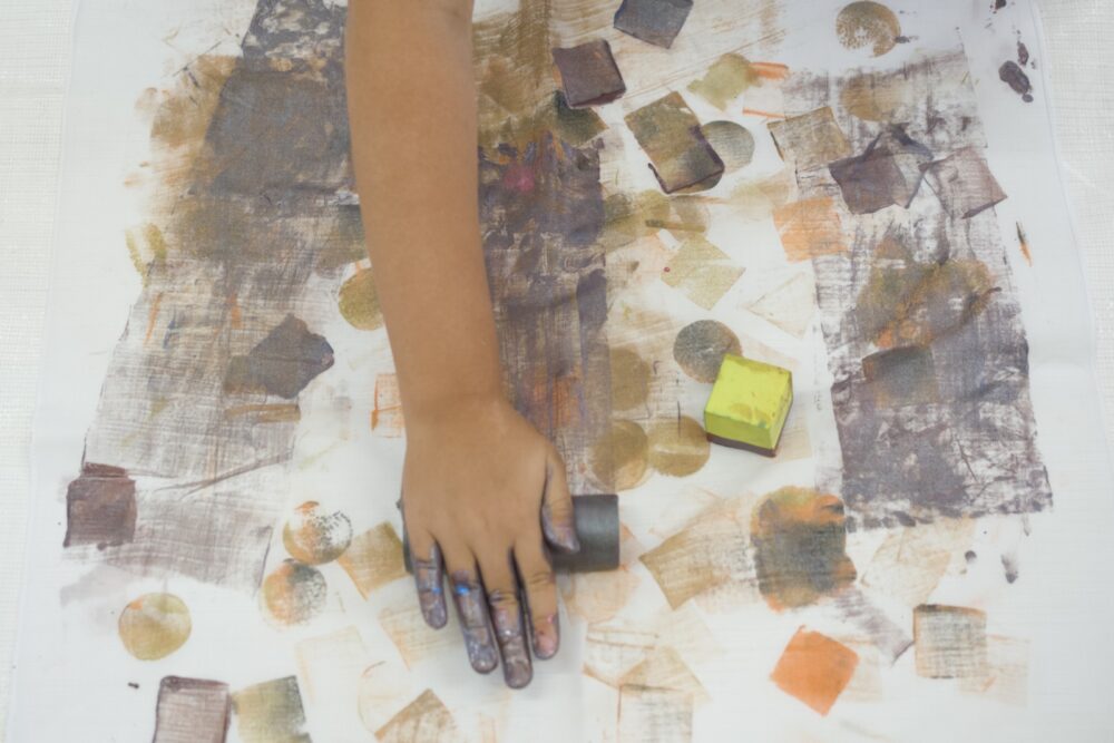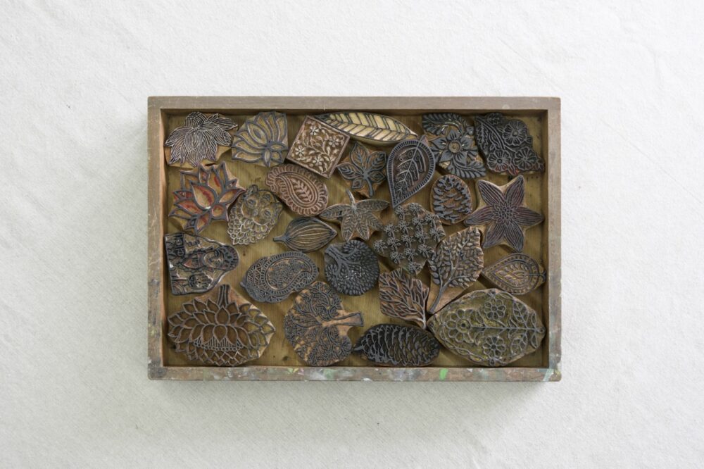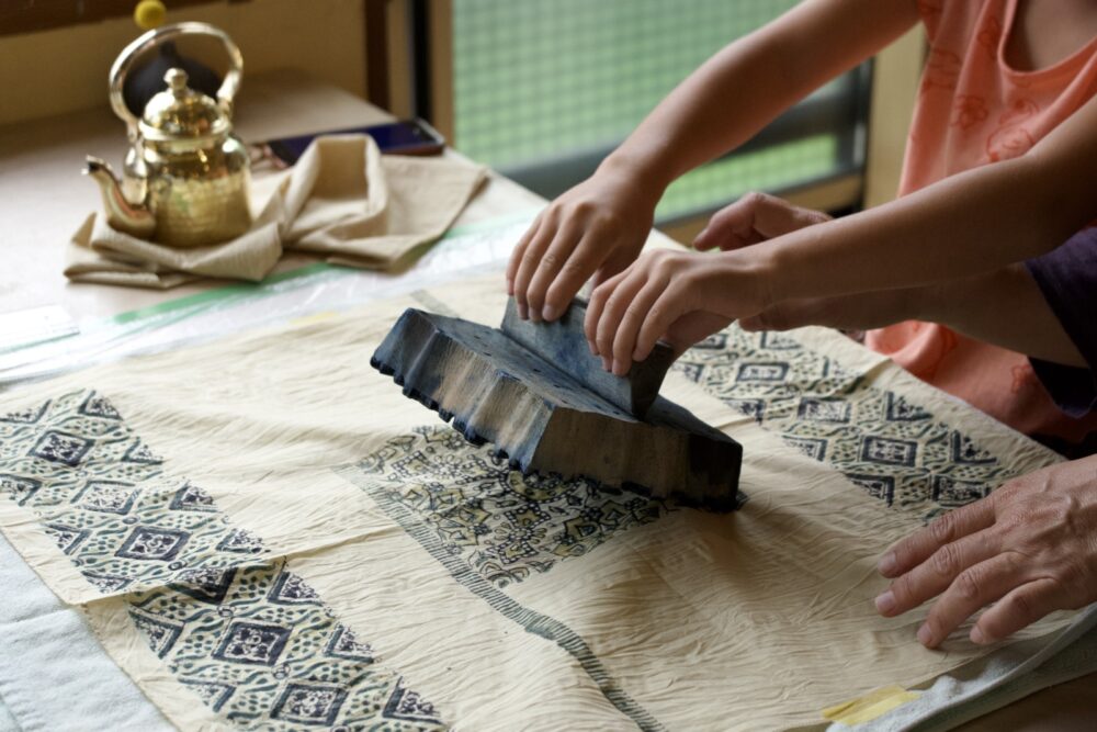 ハンコを手で押して、布に模様を染めるブロックプリントは、インドなどで昔から行われてきた染色の技法です。今回は、様々な形の模様を自由に組み合わせて、自分だけのハンカチを染めます。布に色が染まっていく面白さや、同じ版でも押し方で表情が変わる楽しさを味わっていただけたら。