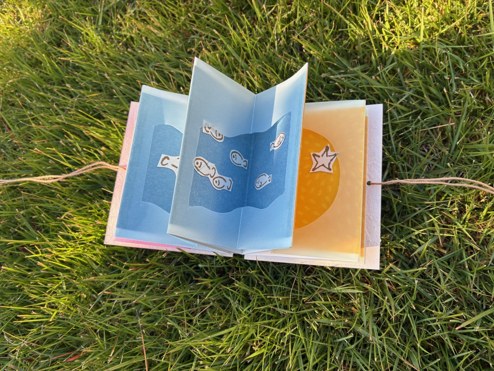 思い出や風景、好きな人や動物など、あなたの「3つの物語」をひとつに綴じてスターブックを作ります。切絵をしたり好きな画材を使ってあなたの手で描きましょう。子どものぐちゃぐちゃっとした線も今しか描けない大切な線。大きめの紙に描いたものを切貼りする方法もありますので、失敗を気にせず表現してください。仕上げは手製本で行います。用意した材料を使いますので、カッターは使用しません。星形のモビールのように飾れます。